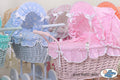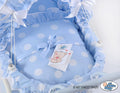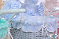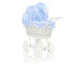 Dockvagn i rotting med blå klädsel och vaddering - vit