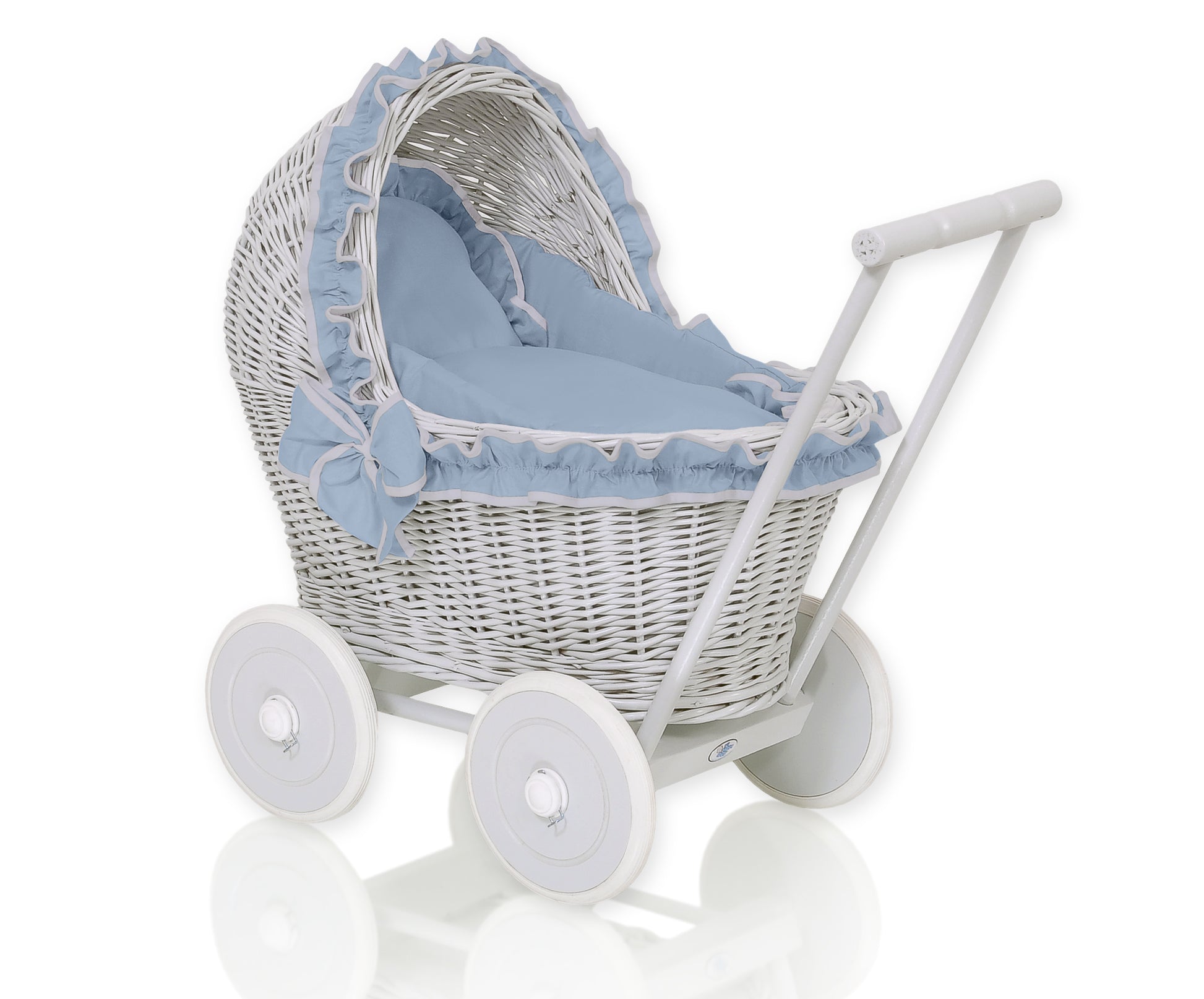 Denna vackra dockvagn är handgjord av polsk rotting, med ett chassi i naturträ och trähjul, målade grå. En snygg och unik present till flickor som älskar att leka med sina dockor. Vagnen har en vacker rundad form och är inredd med mjuk vaddering och ett pastellblått påslakan med kudde och volang.