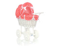 Vit dockvagn gjord av naturvass med röd sängkläder och stoppning