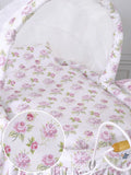 Retro rottingspjälsäng Mia – vit + vit/rosa sängkläder