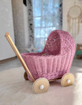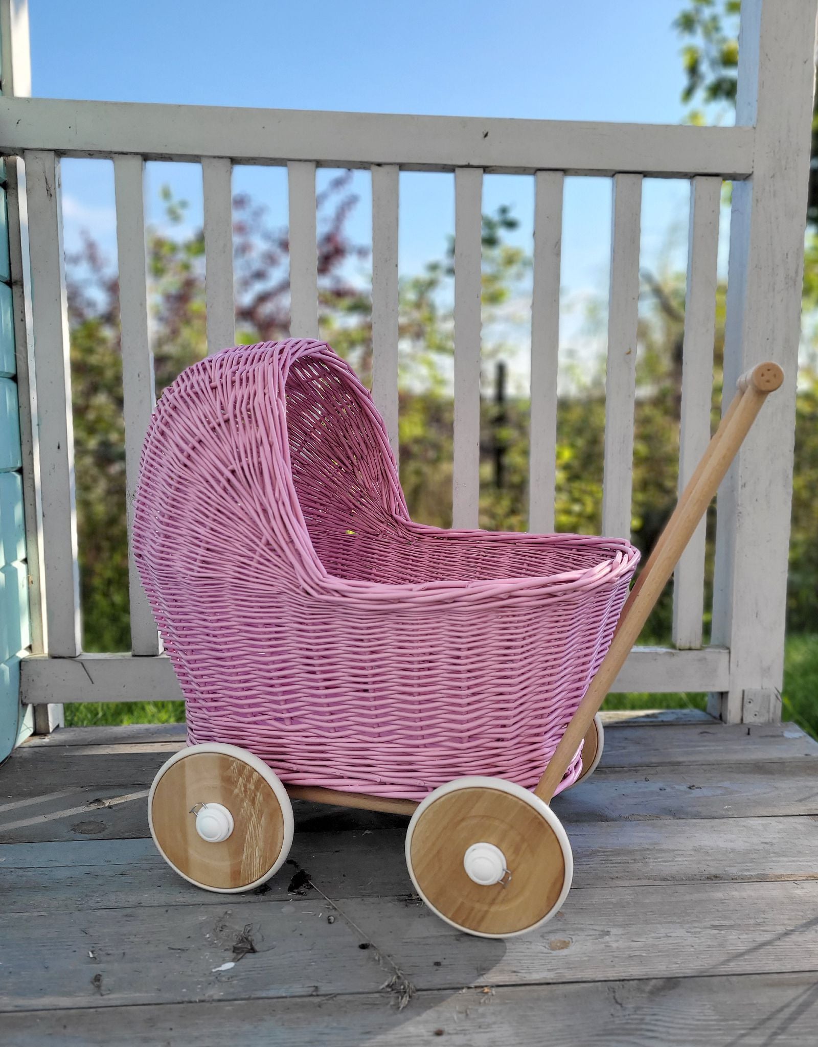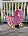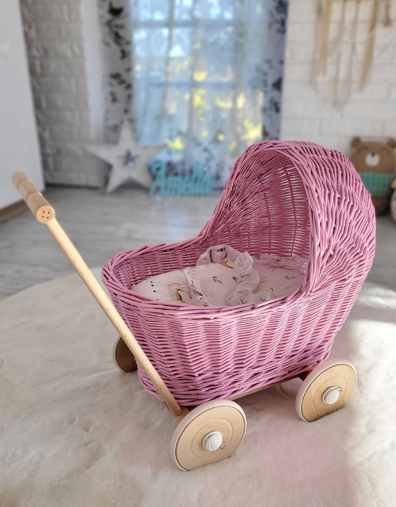 Funktioner hos dockvagnen:- Handflätad korg tillverkad av naturlig, ekologisk rotting, målad rosa med certifierad barnsäker färg.