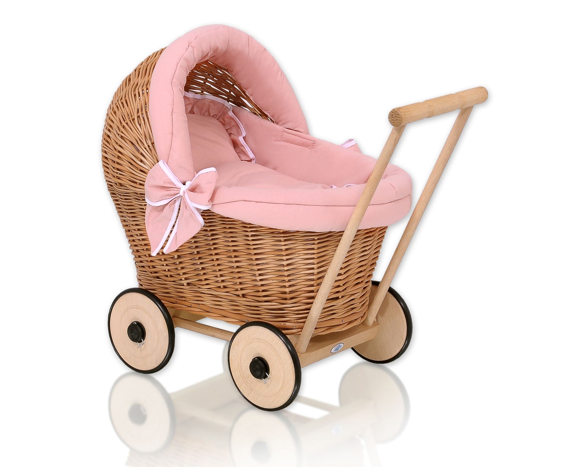 Denna vackra dockvagn är handgjord av ekologiskt odlad, naturlig polsk rotting, monterad på ett robust bokträchassi med trähjul. En unik och snygg present till alla små flickor!