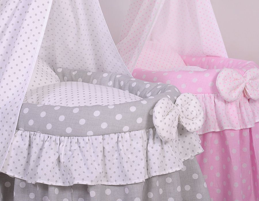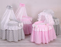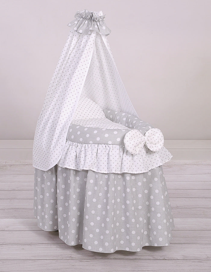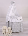 Flätad dockvagga - dockkorg - handgjord, med huva, komplett sängkläder, grå