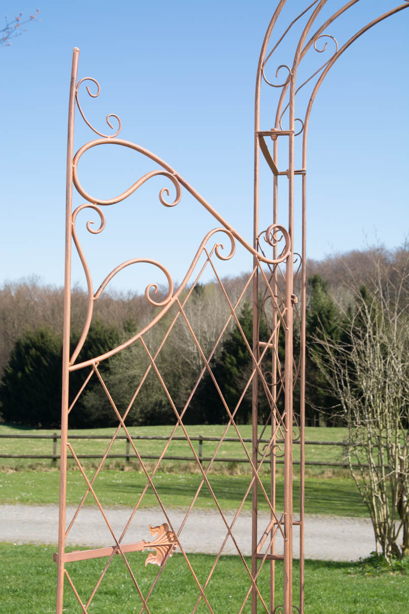 Vår exklusiva rosenbåge med grind är kärleksfullt dekorerad med många detaljer, vilket gör den idealisk som spaljé för murgröna och andra klätterväxter. Denna båge, med sina två låsbara och vackert dekorerade grindar, är också ett riktigt blickfång i vilken trädgård som helst. Rosenbågen är handgjord av järn, vilket garanterar extrem styrka. En speciell beläggning ger denna båge hög kvalitet och exceptionell hållbarhet. Detta är avgörande för att skydda bågen från att bukta under full blomning. Totalt fyra prefabricerade hål finns för enkel fastsättning av bågen i marken. Observera att markkrokar för fastsättning inte ingår; de kan köpas separat.