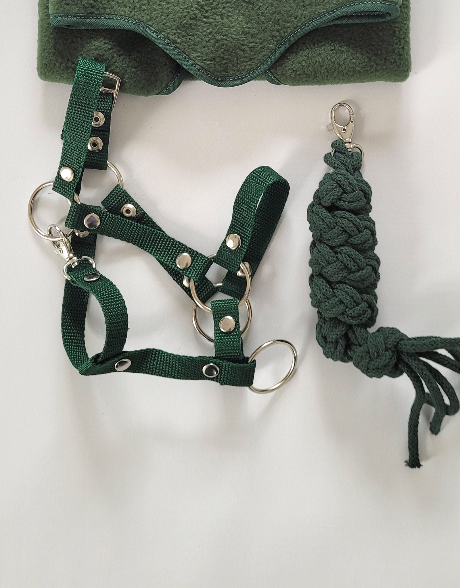Ett praktiskt och slitstarkt set bestående av en justerbar A3-grimma och ett mjukt tether, speciellt utformat för hobbyhästar. Tillverkat av högkvalitativt, slitstarkt 1,5 cm brett band, med ett justerbart spänne för perfekt passform. Grimman fästs enkelt med en silverfärgad karbinhake och har robusta metallelement som spännen och ringar, som är både eleganta och funktionella.