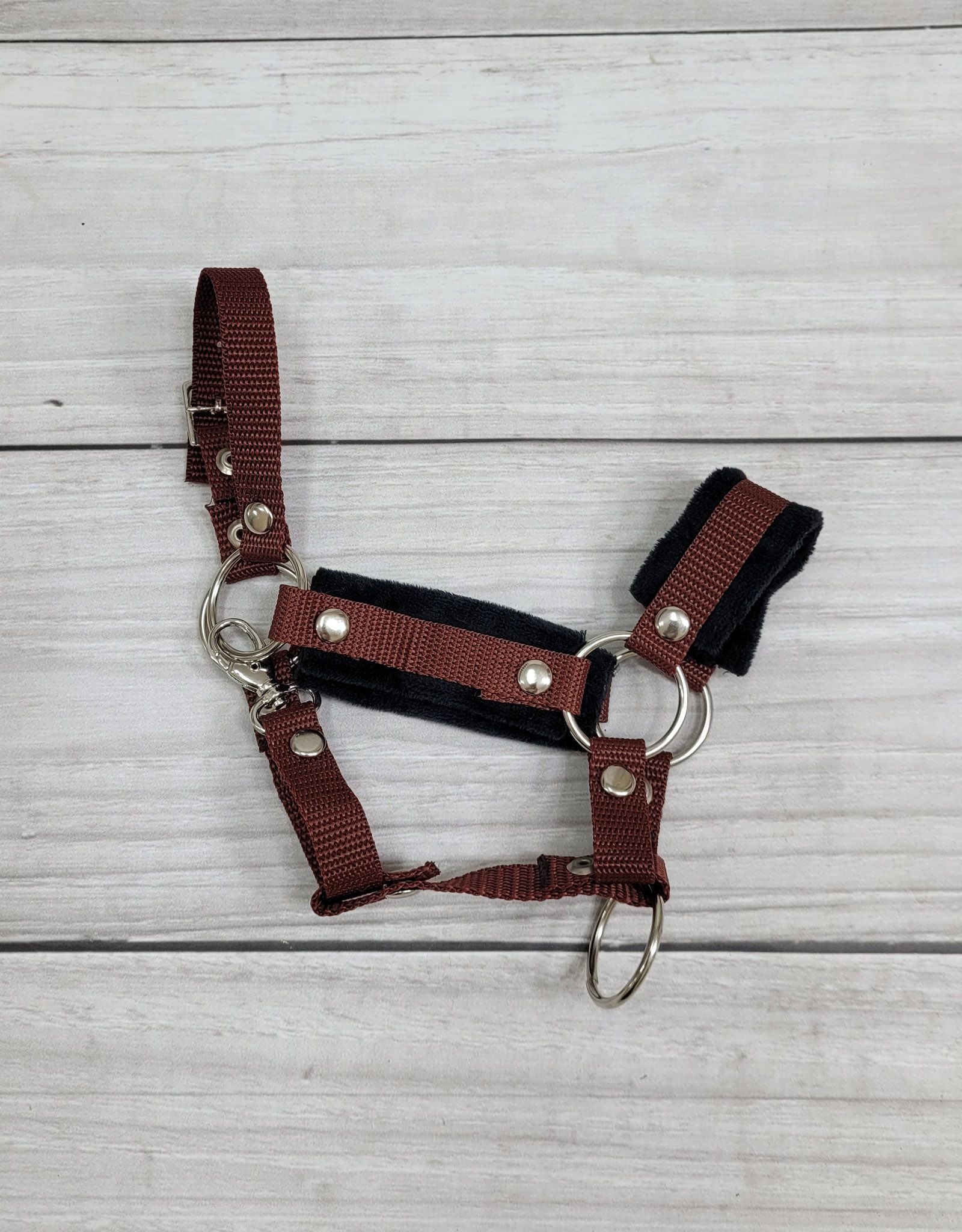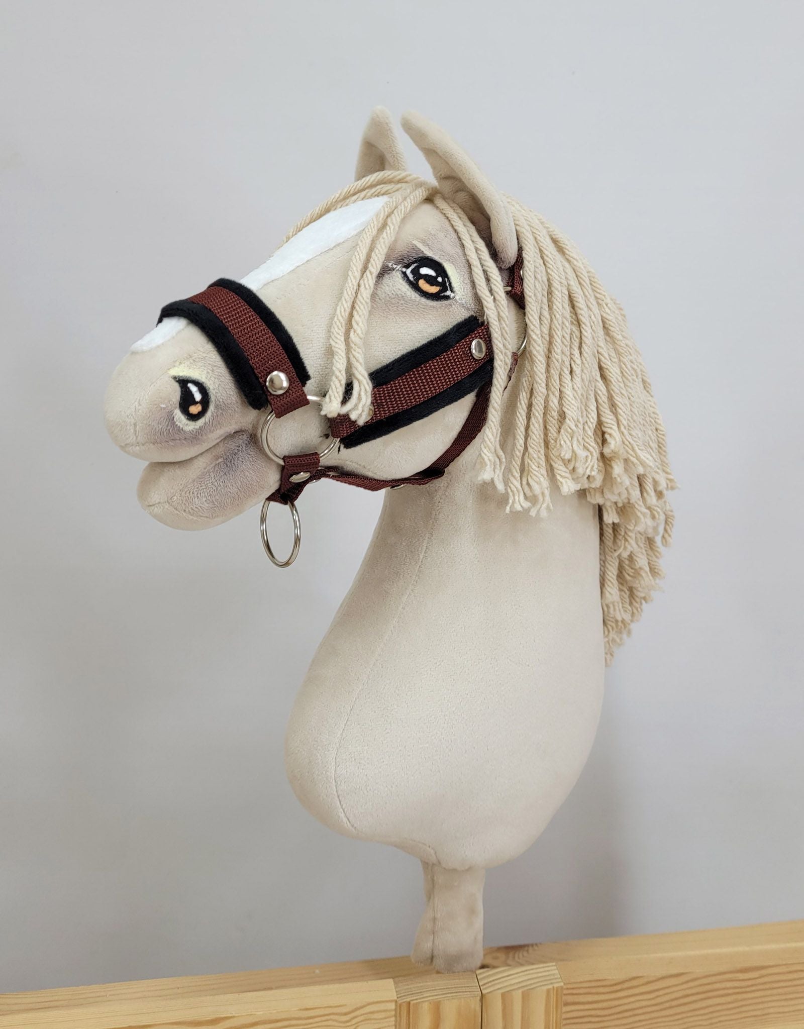 Detta praktiska och hållbara set består av en justerbar grimma och ett handgjort rep för promenader, speciellt utformat för hobbyhästar.
