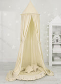 Tälttaket är tillverkat av 100 % bomull, certifierat enligt Oeko-Tex-standarder, och har praktiska sidoband för att knyta ihop det som ett vackert tält. Den övre ringen är avtagbar och tillverkad av slitstark polypropen.