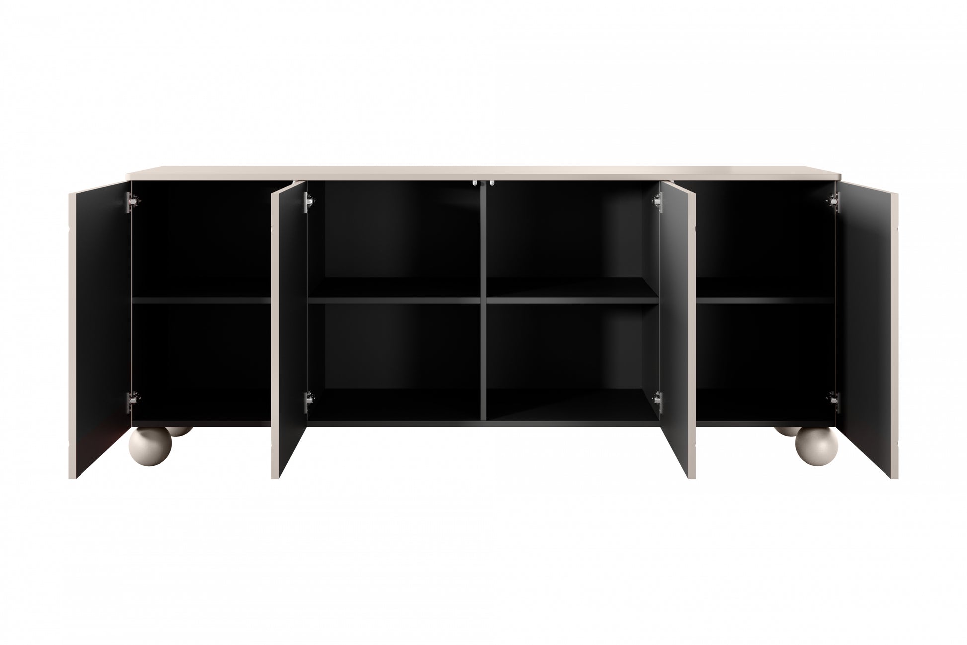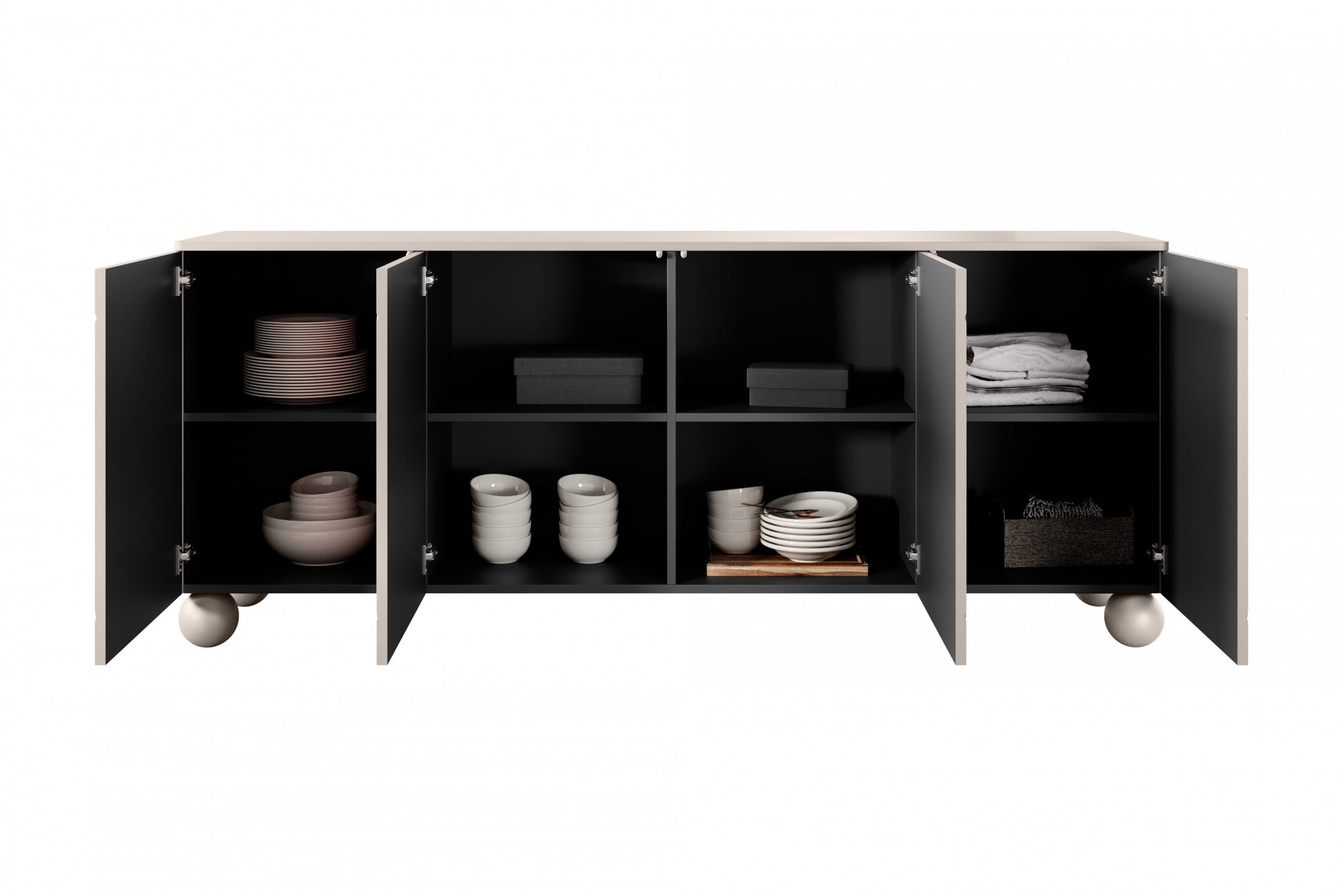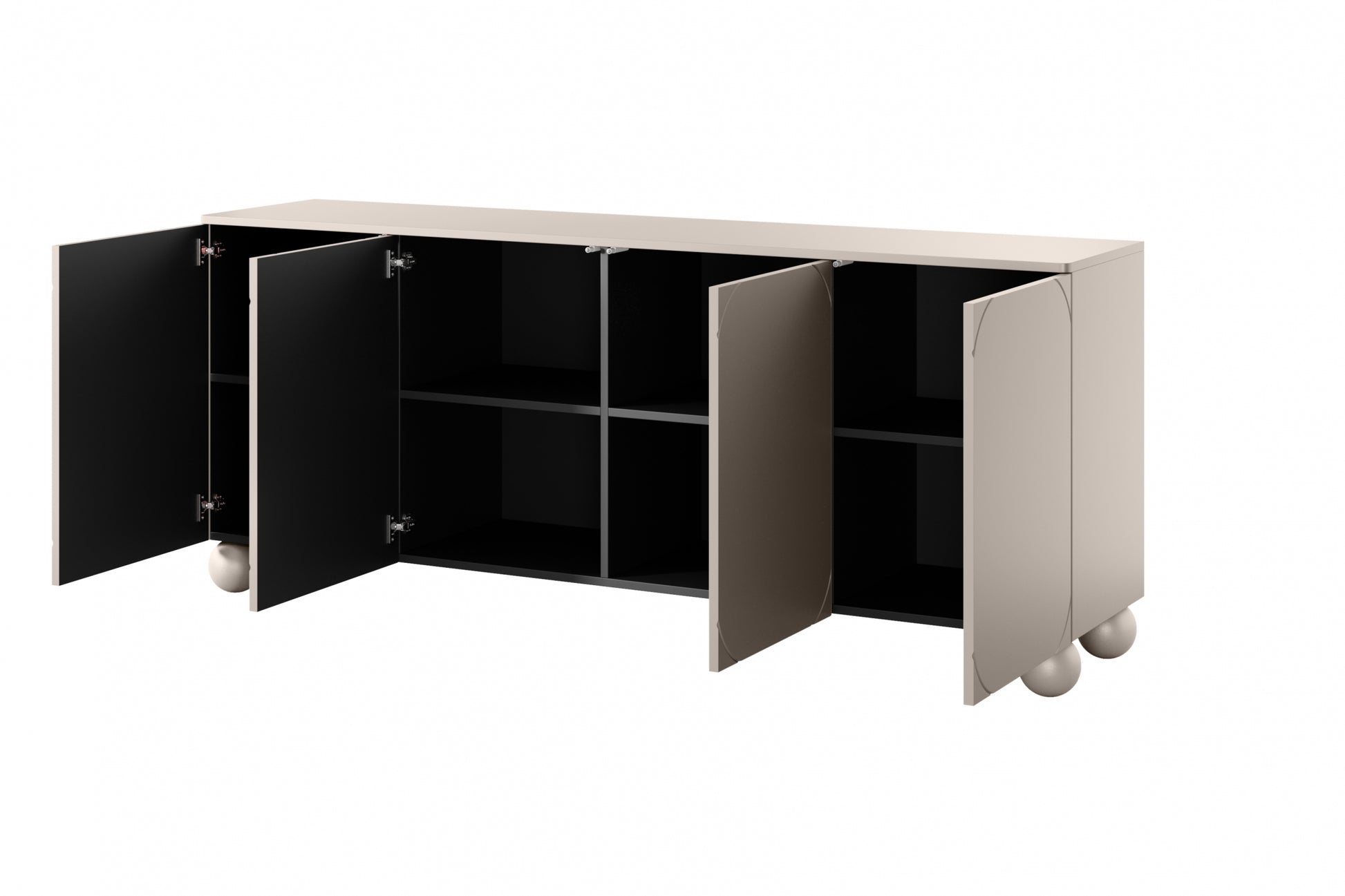 De Sonatia II 200 cm vierdeurs ladekast op krukkenpoten in kasjmierkleur biedt het perfecte evenwicht tussen functionaliteit en stijl. Het moderne ontwerp met een matte kasjmier afwerking straalt subtiele elegantie uit, terwijl de zwarte metalen poten op ballen een eigentijdse uitstraling geven. Gemaakt van 18 mm dik MDF-plaat, garandeert deze ladekast stabiliteit en duurzaamheid. Vier ruime deuren met "push to open" systeem en geruisloze stalen scharnieren zorgen voor optimaal gebruiksgemak. De gelamineerde planken bieden volop opbergruimte voor elk interieur.
