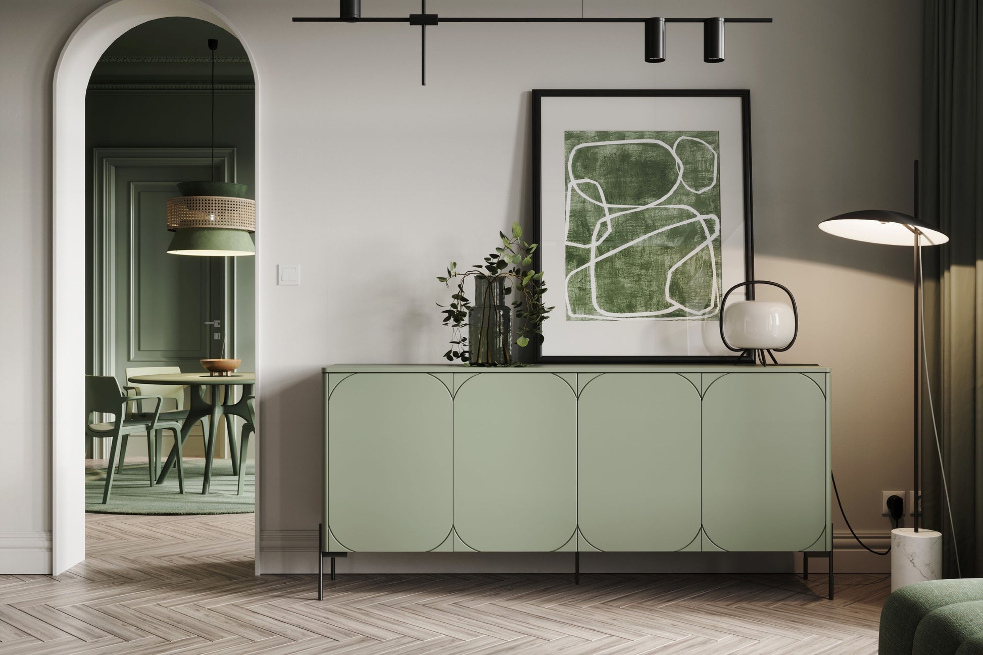 Sonatia ladekast met 4 deuren en metalen poten - Opbergruimte & push-to-open | Olijfgroen