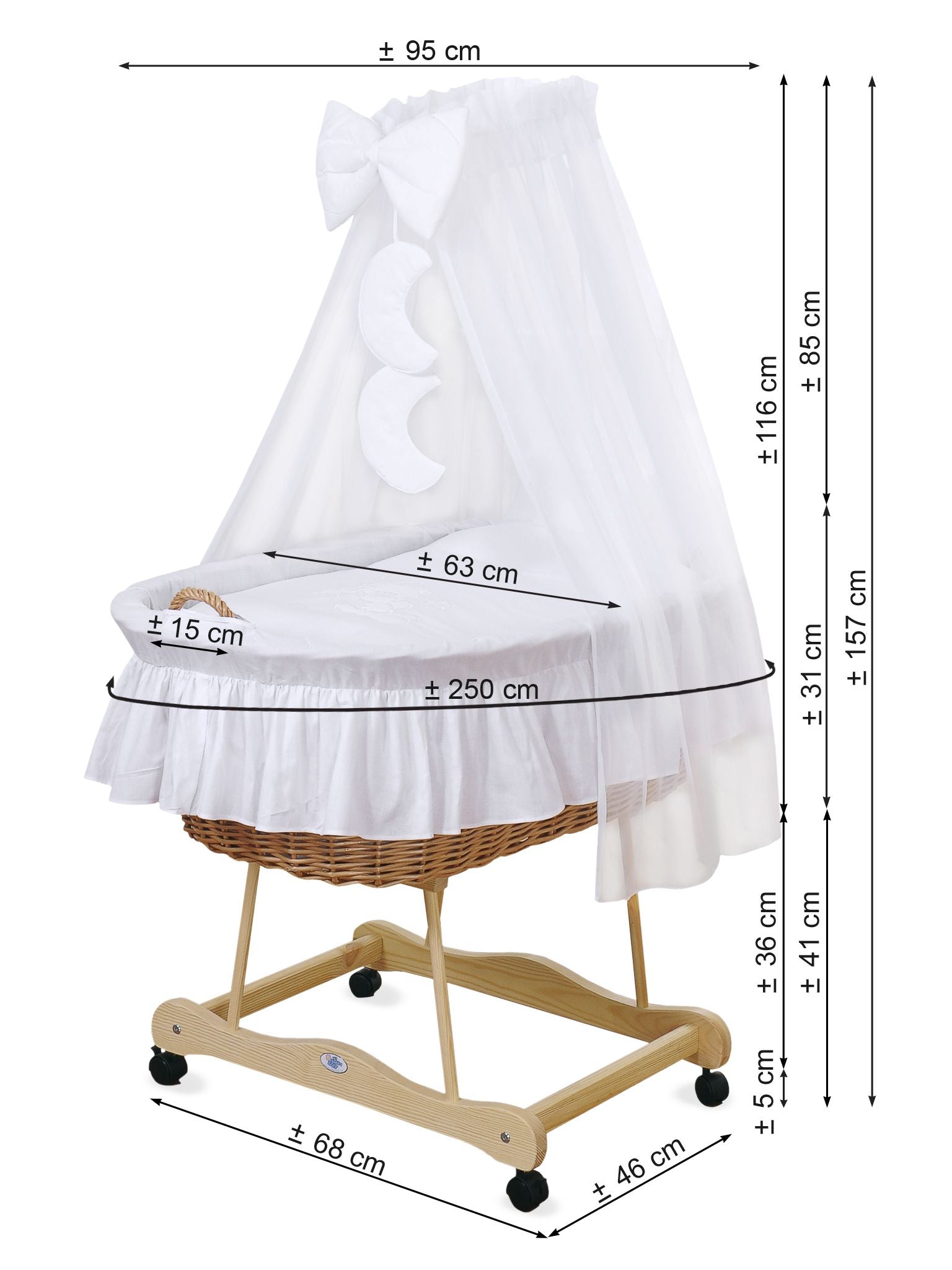 En vacker spjälsäng, den största på marknaden. Tillverkad av vit rotting och trä, inkluderar komplett sängkläder och en matchande himmel, som visas på bilden.