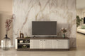 Breng stijl en functionaliteit in uw woonkamer met het Vesper 3D TV-meubel van 187 cm. Dit moderne staande TV-meubel combineert een elegante kasjmierkleur met warme walnootaccenten en opvallende zwarte handgrepen. De gegroefde MDF-fronten en afgeronde randen geven het meubel een verfijnde uitstraling die perfect past binnen hedendaagse designtrends. Het solide frame van gelamineerd karton en MDF zorgt voor duurzaamheid, terwijl ABS-randen extra bescherming bieden. Met drie ruime kasten, een handige plank en een praktisch kabelgat biedt deze kast alles voor een georganiseerde mediahoek.
