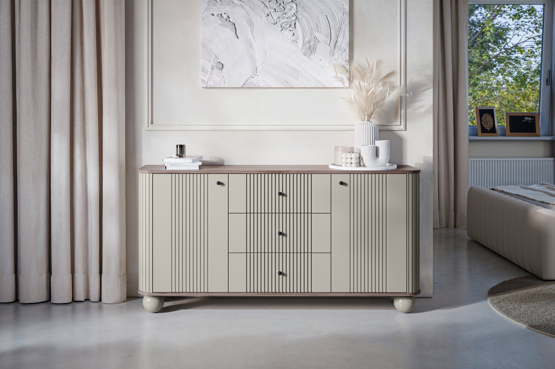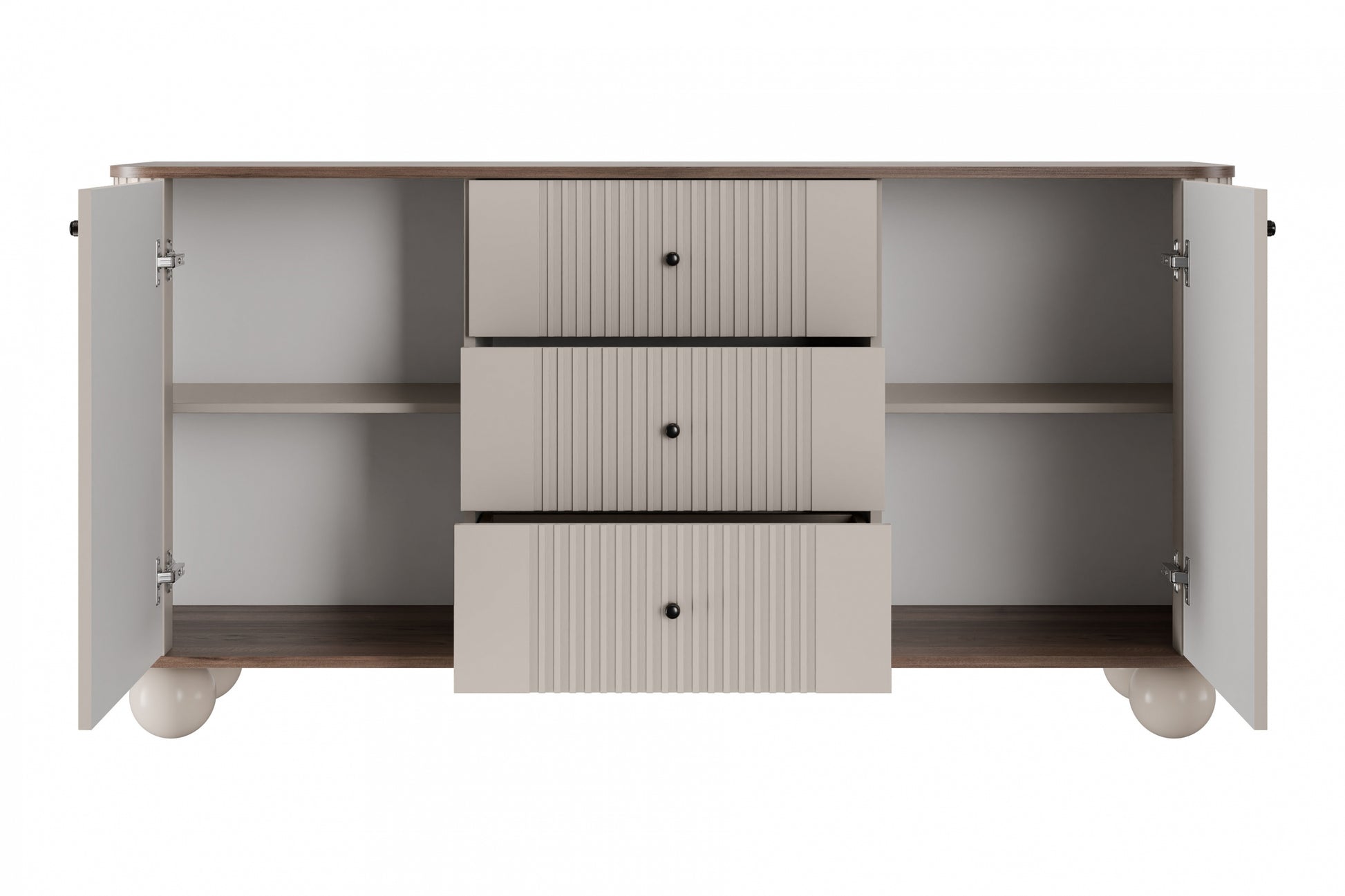 Vesper ladekast 160 cm – 3 lades, 2 deuren, massief houten poten | Kleur: kasjmier, walnoot & zwart
