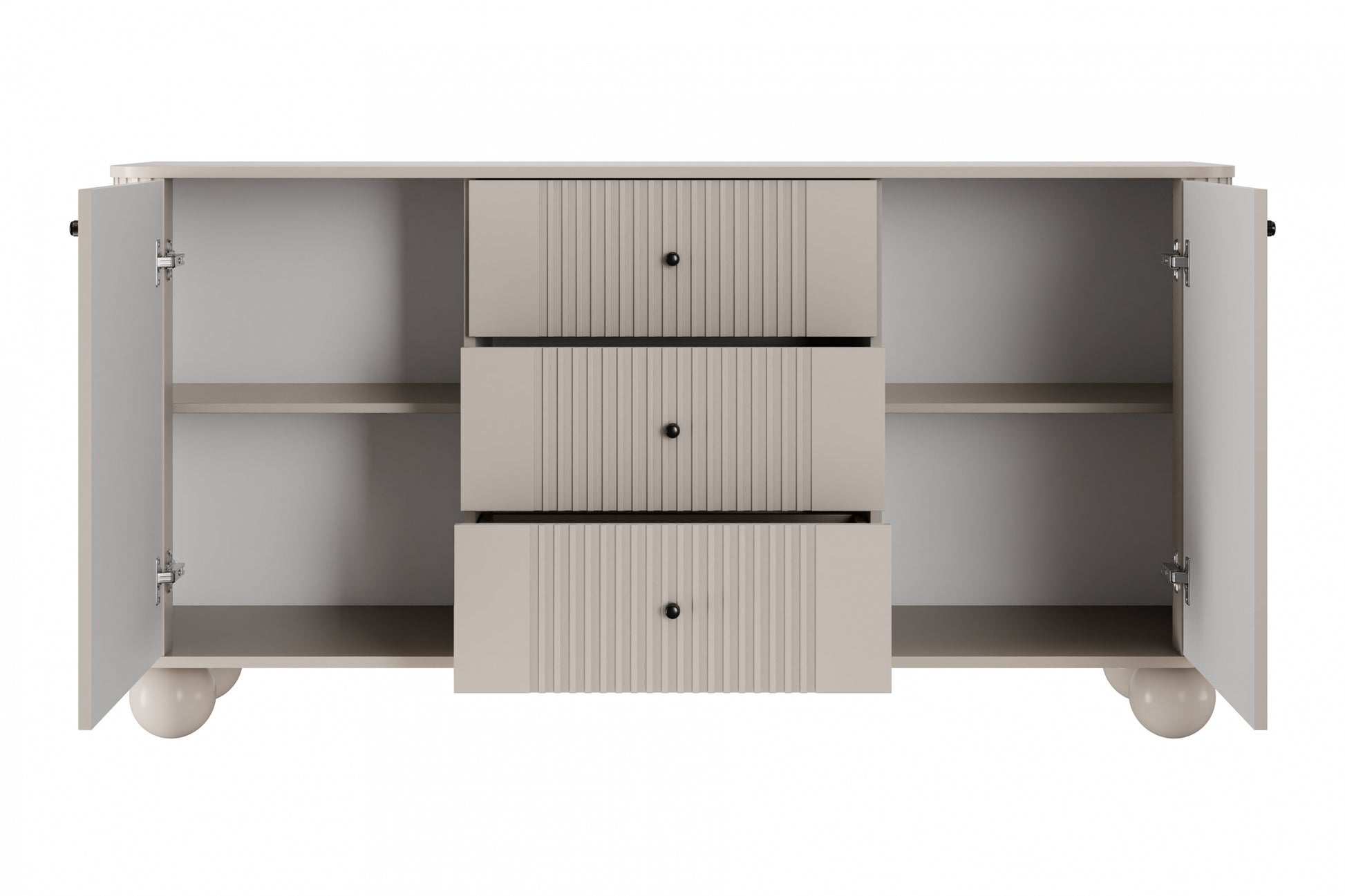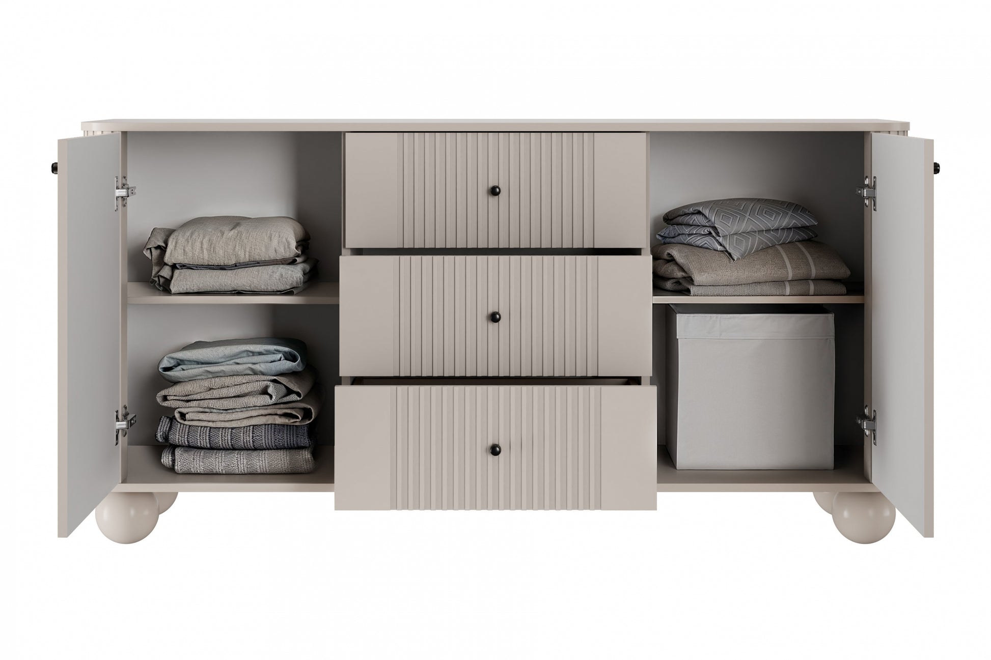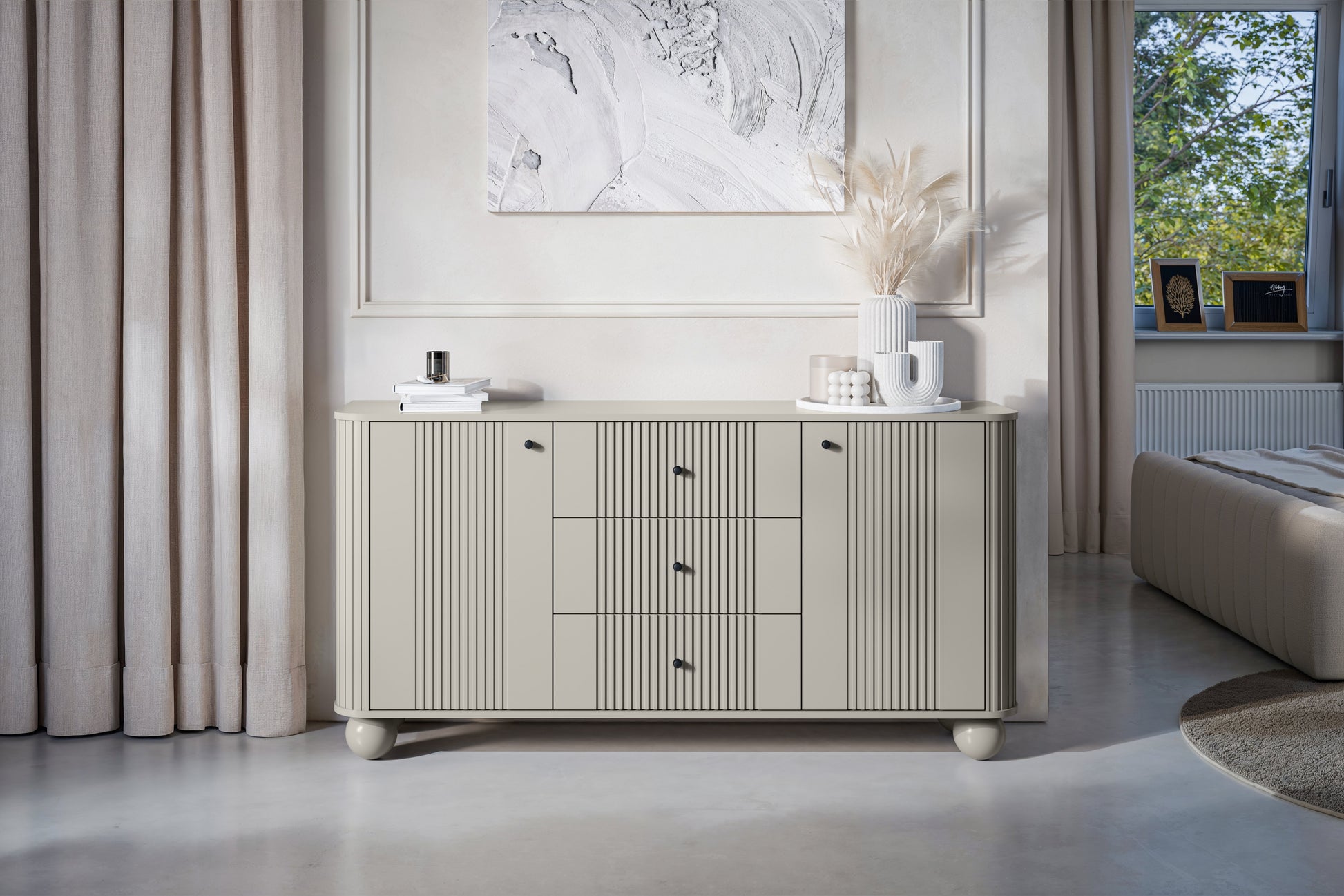 Vesper Ladekast 160 cm – Kasjmier met Zwarte Handgrepen en Bolpoten