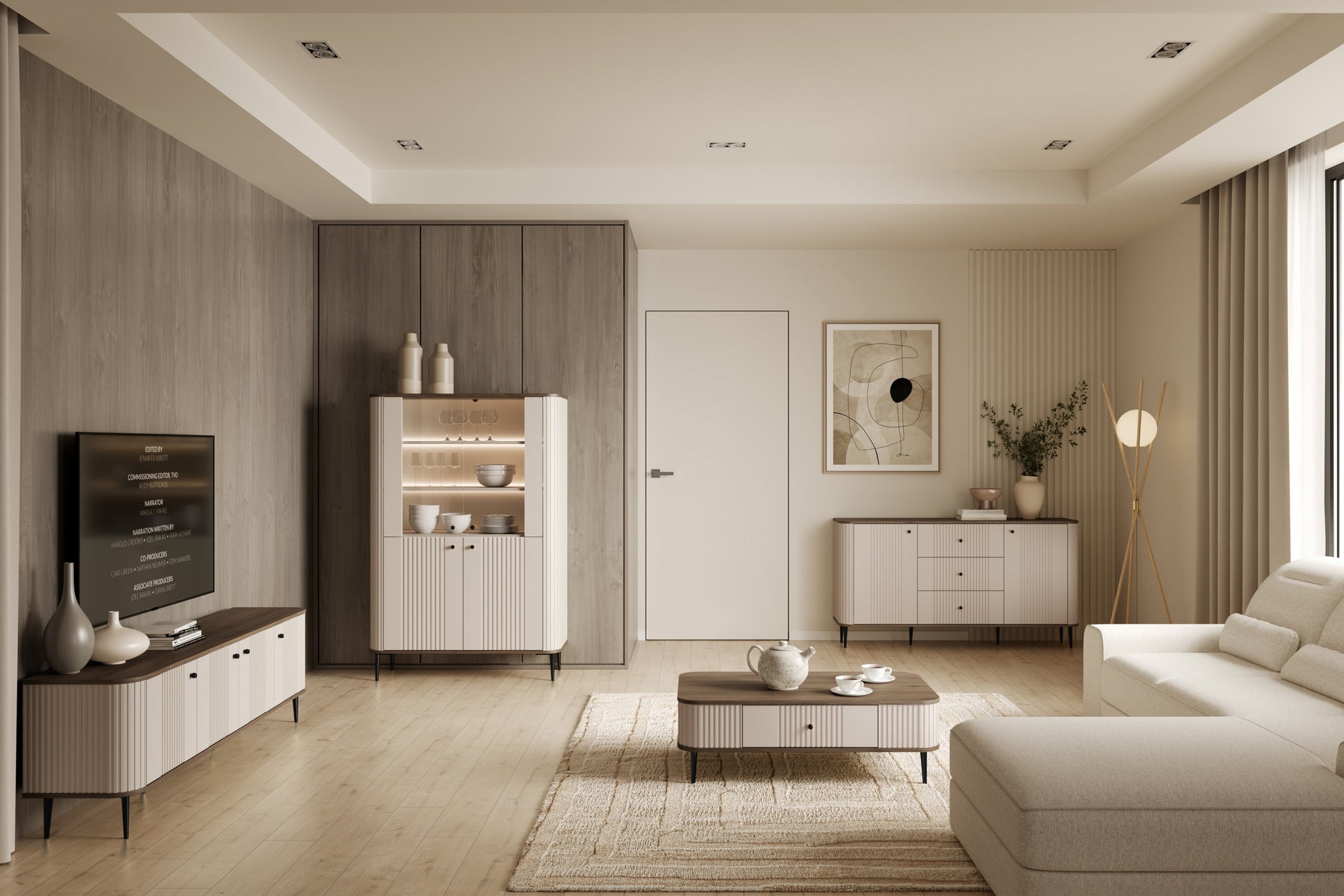 Geef uw woonkamer direct een stijlvolle upgrade met de Vesper vitrinekast in de elegante combinatie van kasjmier, warme walnoot en moderne zwarte poten. Deze kast is voorzien van afgeronde, gegroefde MDF-fronten en subtiele details die het meubel een unieke uitstraling geven. Dankzij de hoogwaardige constructie van gelamineerde plaat en 16 mm dik MDF geniet u van duurzame kwaliteit en een langdurig fraaie afwerking. De ingebouwde LED-verlichting zet uw decoraties prachtig in de schijnwerpers, terwijl de ABS-randen zorgen voor extra bescherming tegen slijtage.