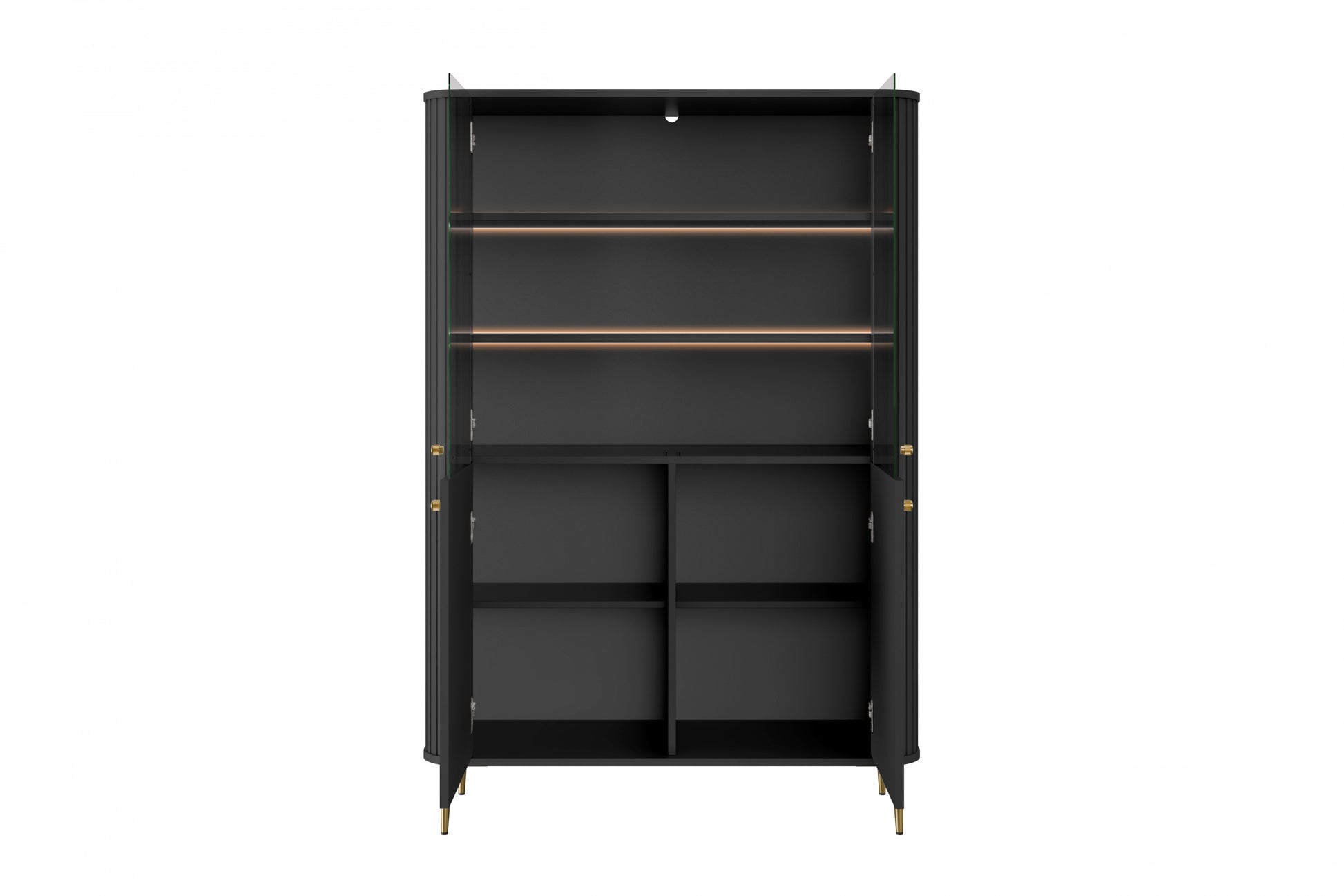 Ontdek de Vesper vitrinekast: een moderne eyecatcher die luxe en functionaliteit combineert in uw woonkamer. De diepzwarte kleur, elegante gouden metalen poten en verfijnde details zoals geribbelde MDF-fronten en afgeronde randen maken deze kast een opvallend meubelstuk. Met vier deuren en vier ruime planken biedt de Vesper vitrinekast volop plaats voor boeken, servies en decoraties. Het matte oppervlak en de hoogwaardige afwerking van gelamineerd karton en MDF zorgen voor duurzaamheid en een stijlvol uiterlijk. Extra ledverlichting accentueert uw exclusieve stukken in de kast.