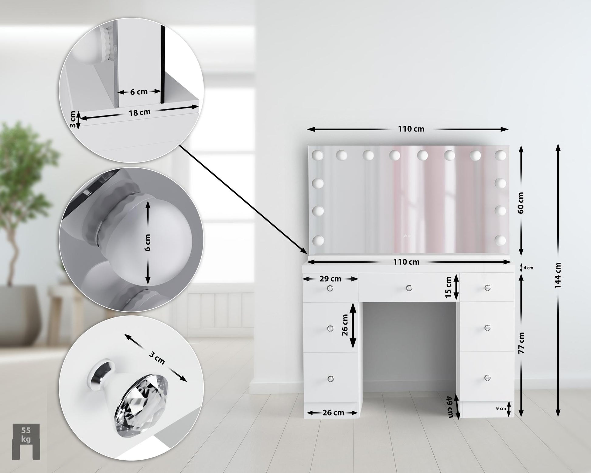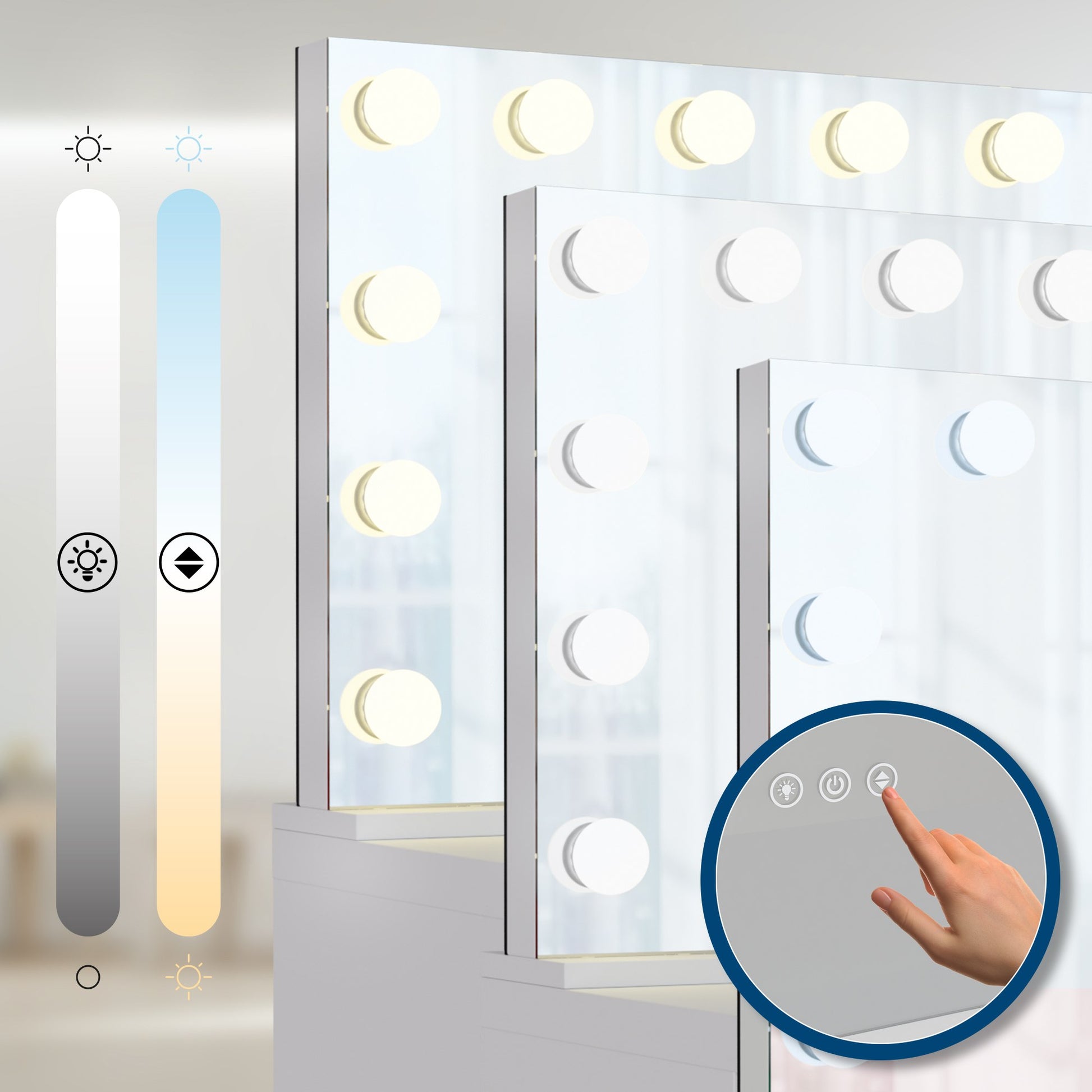 Med en stor spegel omgiven av 14 energibesparande LED-lampor ger sminkbordet alltid perfekt belysning. LED-lamporna är justerbara i tre olika ljuslägen (varmvitt, neutralvitt och kallvitt) och dimbara, så att du kan justera ljusstyrkan efter dina önskemål.