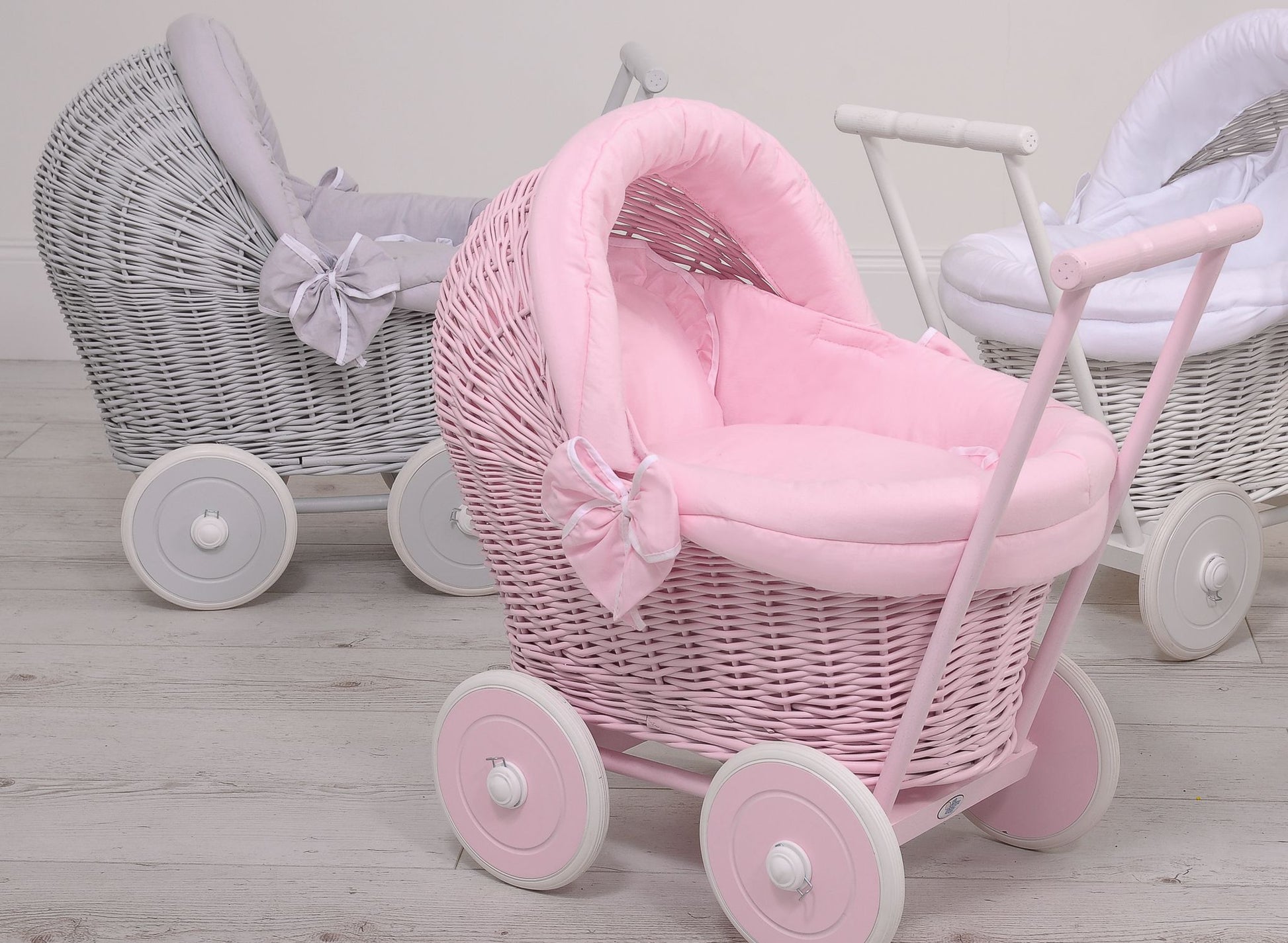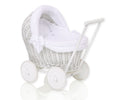 Denna vackra dockvagn är handgjord av naturlig polsk rotting, spunnen till en elegant vit vagn med ett chassi och hjul i naturträ. Den är en perfekt, snygg och unik present till en liten flicka. Vagnen har en vacker rundad form och är färdigställd med ett robust, stabilt handtag för bekväm styrning.