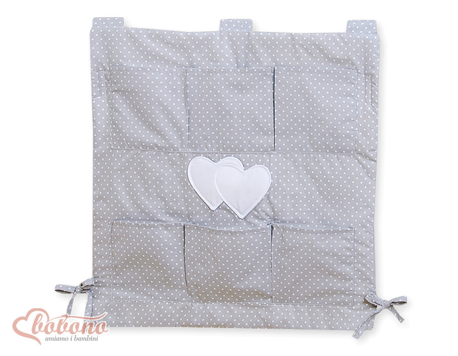 Spjälsängsorganisatör - Hängande hjärtan Praktisk spjälsängsförvaring med ett vitt prickigt hjärtmönster på grå bakgrund. Denna...