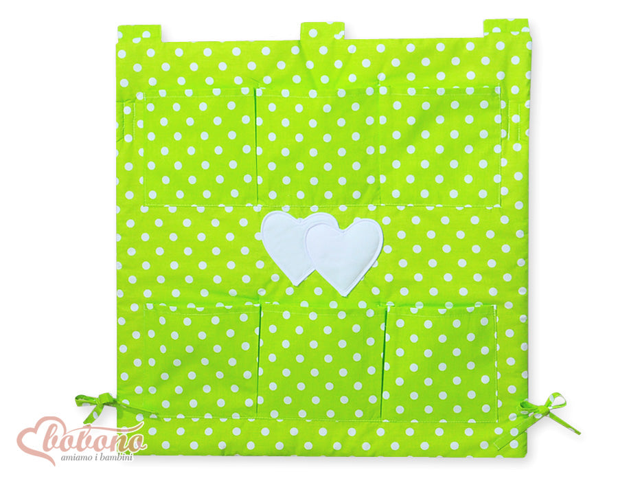 Spjälsängsorganisatör - Hängande hjärtan Praktisk spjälsängsförvaring i fräscht vitt och grönt, med ett sött prickigt...