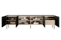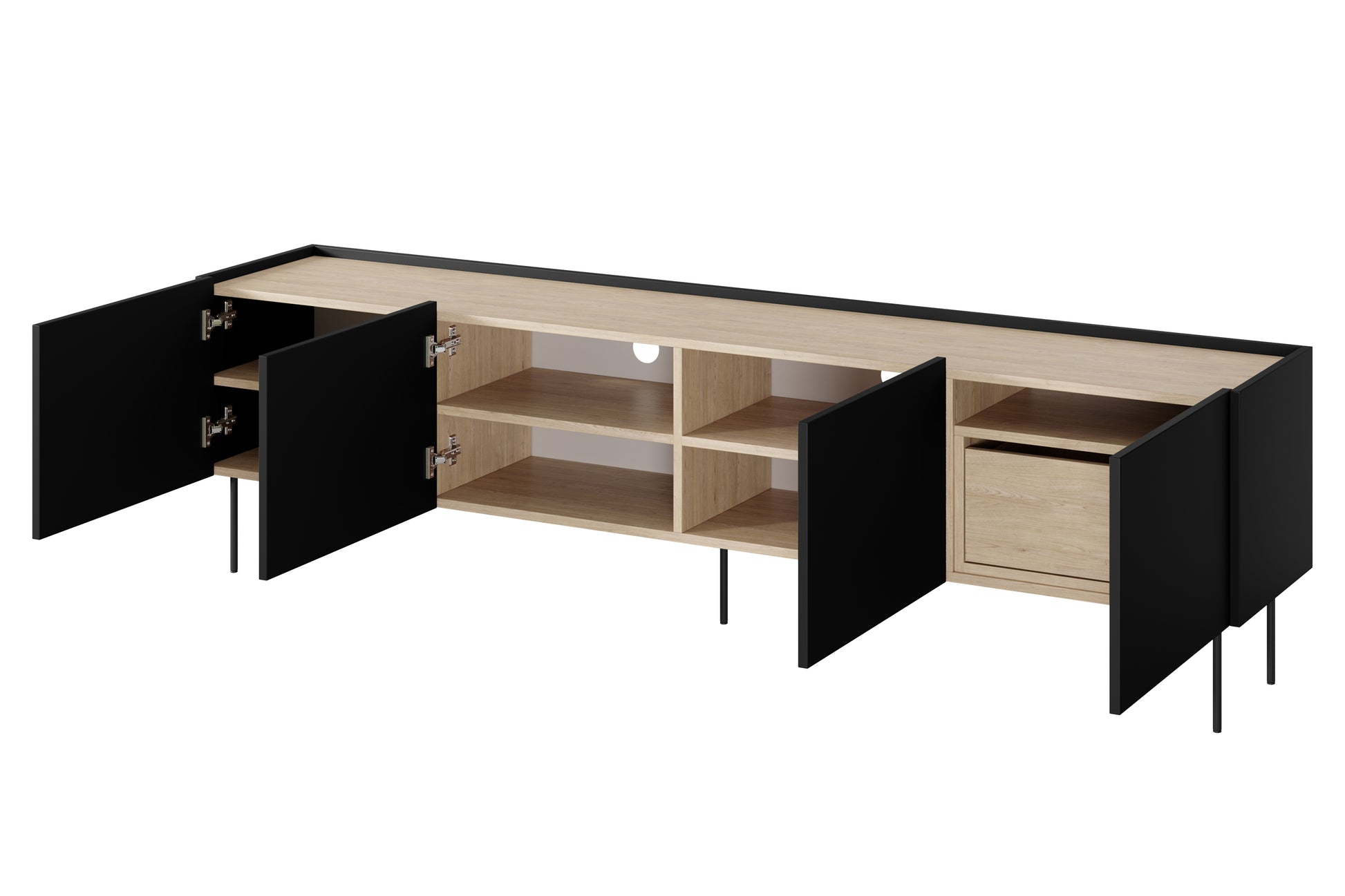 Het Desin TV-meubel van 220 cm combineert moderne elegantie met functioneel design. De stijlvolle matzwarte body en voorkant contrasteren prachtig met het warme nagano eiken aanrechtblad. Dankzij de 18 mm dikke, gelamineerde plaat is deze kast krasbestendig en duurzaam in gebruik. Met vier deuren, drie planken en een verborgen lade biedt het tv-meubel volop opbergruimte voor al uw apparatuur en accessoires. De stevige metalen poten zorgen voor een stabiele basis, terwijl het geruisloos sluitende systeem het gebruiksgemak vergroot en schade voorkomt.