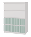 Ontdek de moderne MALWA M4 ARTESO ladekast, een stijlvol opbergmeubel perfect voor kinder- en tienerkamers. Met een strak wit lichaam en opvallende wit/mint ladefronten voorzien van verticale patronen, geeft dit meubel elke ruimte een frisse, eigentijdse uitstraling. Deze grote kist beschikt over vier ruime lades met greeploze afwerking voor een minimalistische look en extra gebruiksgemak. Dankzij hoge kwaliteit afwerking en het nieuwste beslag heeft de kast gladde zijkanten zonder doppen, wat zorgt voor duurzaamheid én een luxe uitstraling.