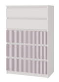 - Kleur: Lichaam wit, voorzijde wit/roze (verticale roze patronen op 3 onderste lades)