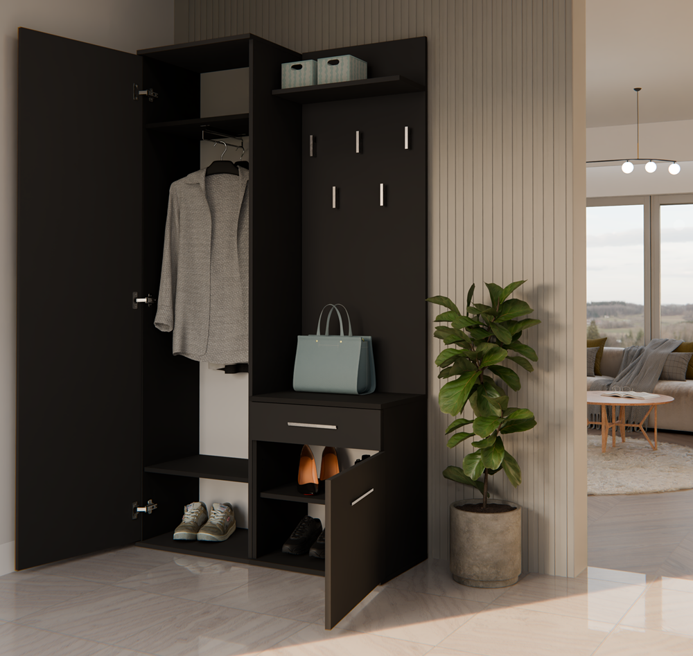 Maak kennis met de "DUO" garderobe: een stijlvolle en praktische oplossing voor elke hal of entree. Dit moderne meubelstuk bestaat uit een grote kast met spiegel, een handige lade en een kleiner kastje, aangevuld met vijf hangers en een royale plank. Het minimalistische, matte zwarte design straalt luxe uit en past perfect in elk modern interieur. Zowel de kastdeuren als de opstelling van de garderobe zijn flexibel aan te passen, zodat de indeling altijd aansluit op uw wensen. Ideaal voor wie functionaliteit én elegantie belangrijk vindt.