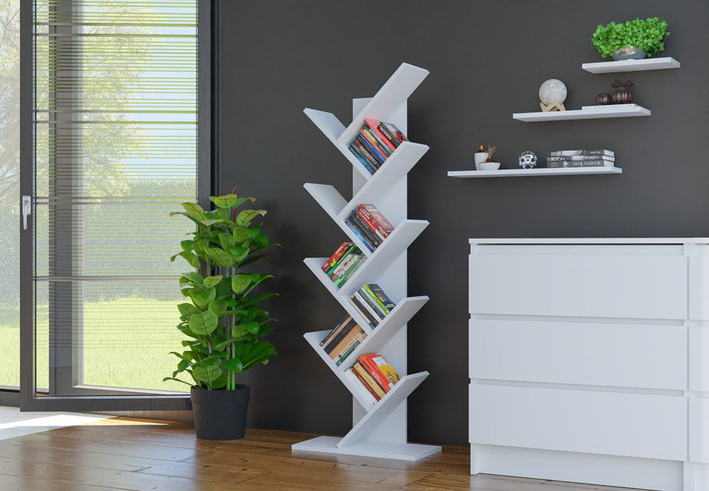 Breng stijl en functionaliteit samen met de moderne open wandplank 'GRAPPIG' in mat wit. Dit tijdloze ontwerp heeft acht schuine geometrische planken die ideaal zijn voor het organiseren van boeken, gadgets, speelgoed of verzamelobjecten. Dankzij de open structuur presenteer je eenvoudig je favoriete items in de woonkamer, studeerkamer, kantoor of slaapkamer. Het fijne fineer aan zowel de voor- als achterkant zorgt voor een elegante uitstraling, terwijl de stevige afwerking garant staat voor langdurig gebruik.