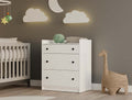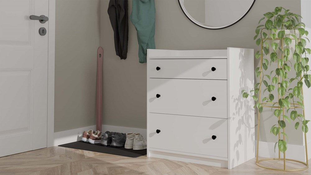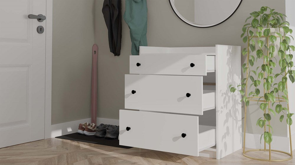 De HOUSTON ladekast is een stijlvolle en veelzijdige opbergoplossing die past in elke ruimte: van kinderkamer tot woonkamer. Met zijn strakke, minimalistische vorm, elegante witte kleur en matte zwarte metalen handgrepen maakt deze kast indruk in zowel moderne als klassieke interieurs. Drie ruime lades op soepele rolgeleiders bieden volop plek voor kleding, accessoires en textiel. De verhoogde randen op het blad voorkomen het wegglijden van kleine spullen. Dit stabiele meubel is compact, ideaal voor zowel grote als kleine ruimtes en eenvoudig te reinigen.