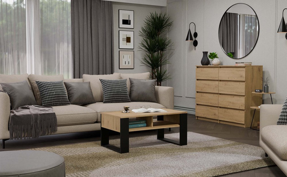 Ontdek de strakke uitstraling van de Modern 2P salontafel, ontworpen voor de hedendaagse woonkamer. Deze stijlvolle salontafel, in de kleuren artisan eiken en zwart, combineert een modern design met functionaliteit. Het ruime tafelblad biedt voldoende plek voor decoratie, boeken of koffiekopjes, terwijl de extra twee planken onder het blad extra opbergruimte creëren. Gemaakt van gelamineerd spaanplaat met verhoogde krasbestendigheid, is dit meubel zowel duurzaam als gemakkelijk te onderhouden. Dankzij de eenvoudige montage en meegeleverde montagehandleiding zet je de salontafel snel in elkaar.