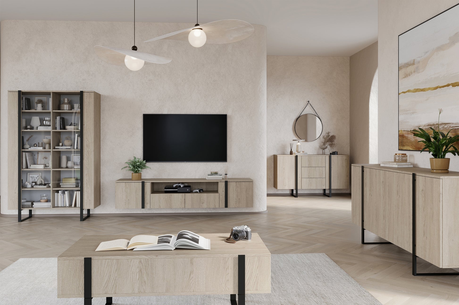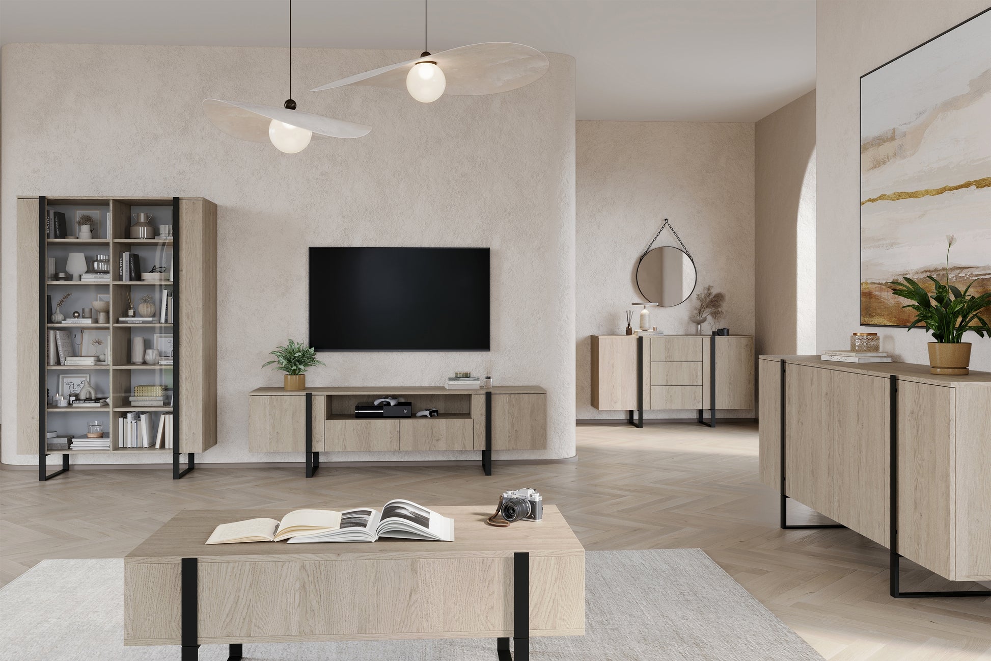 Verica Vitrinekast 120 cm - Biscuit Eiken met Zwarte Metalen Poten