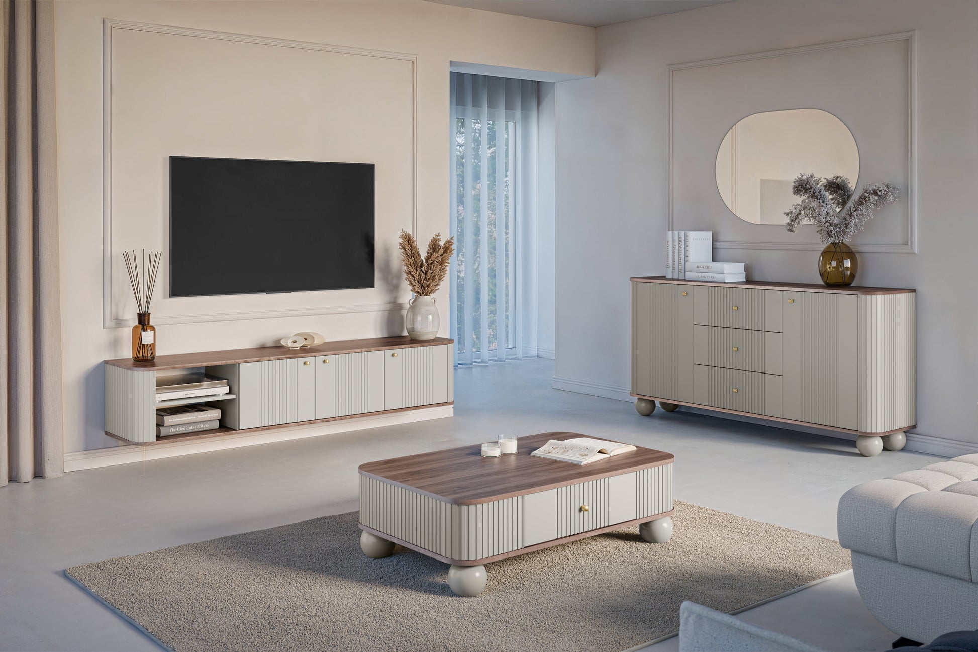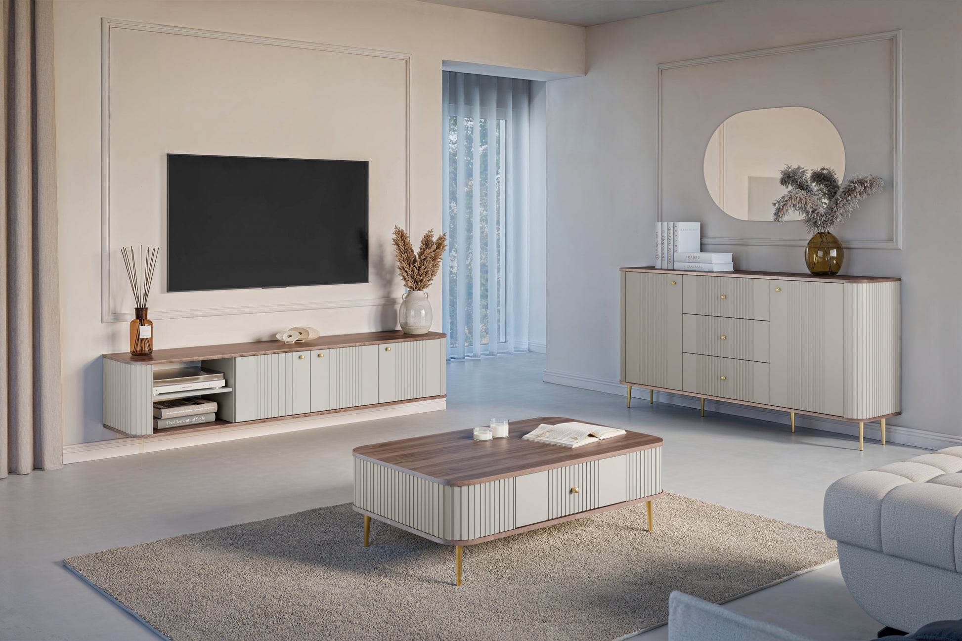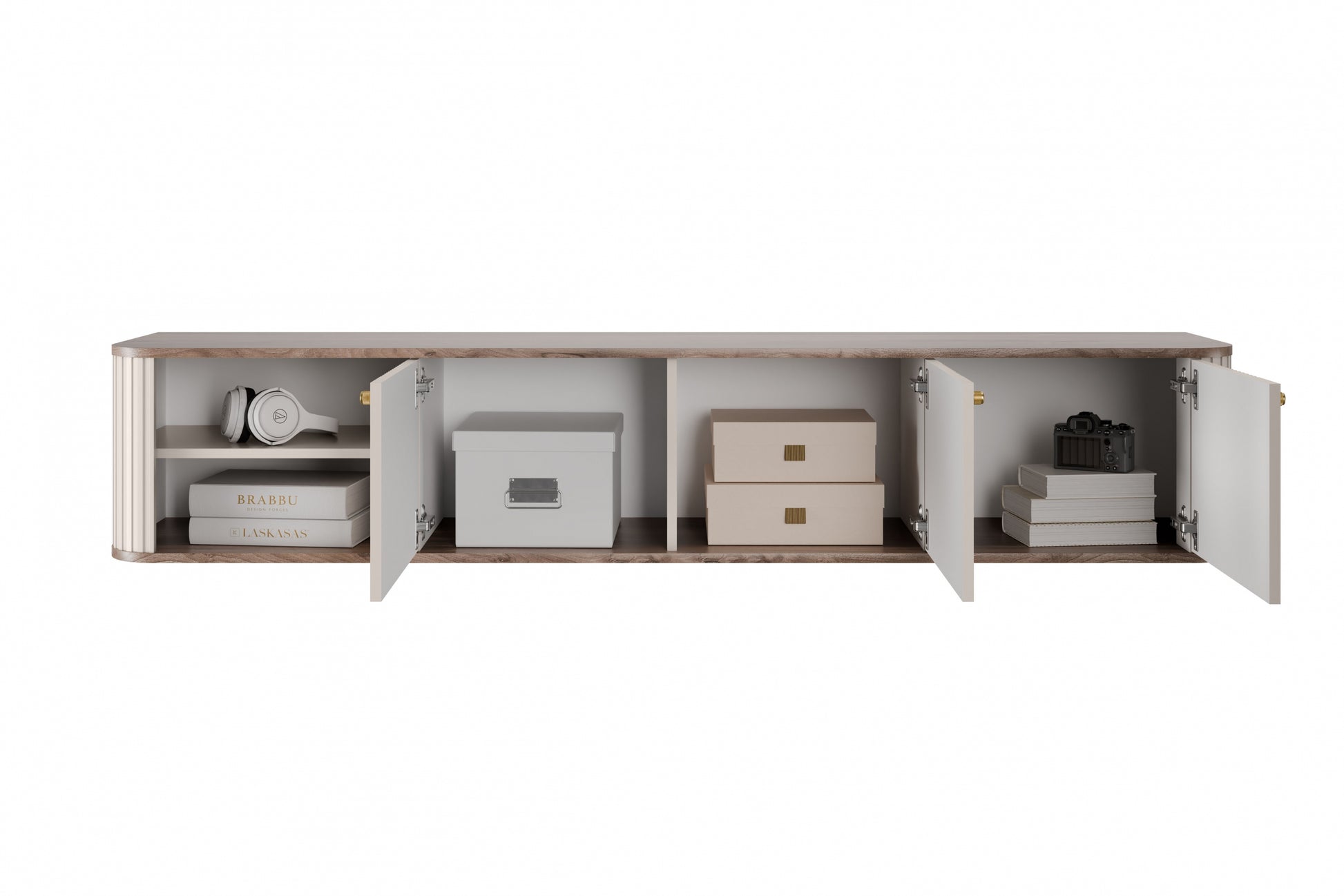 Vesper 3D Hangend TV-meubel 187 cm – Kasjmier/Walnoot/Gouden Handgrepen