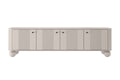 Het Vesper 4D TV-meubel van 187 cm in kasjmierkleur is de perfecte combinatie van functionaliteit en modern design. Dit stijlvolle meubel trekt direct de aandacht met zijn geribbelde, afgeronde fronten en elegante zwarte handgrepen. De massief houten bolpoten geven het meubel een unieke, lichte uitstraling, terwijl het duurzame materiaal en de solide constructie langdurig gebruik garanderen. Dankzij de vier ruime deuren en het geïntegreerde gat voor kabels blijft je woonkamer altijd geordend en strak. Perfect afgestemd op moderne, Scandinavische en glamoureuze interieurs.