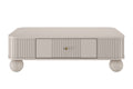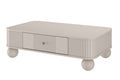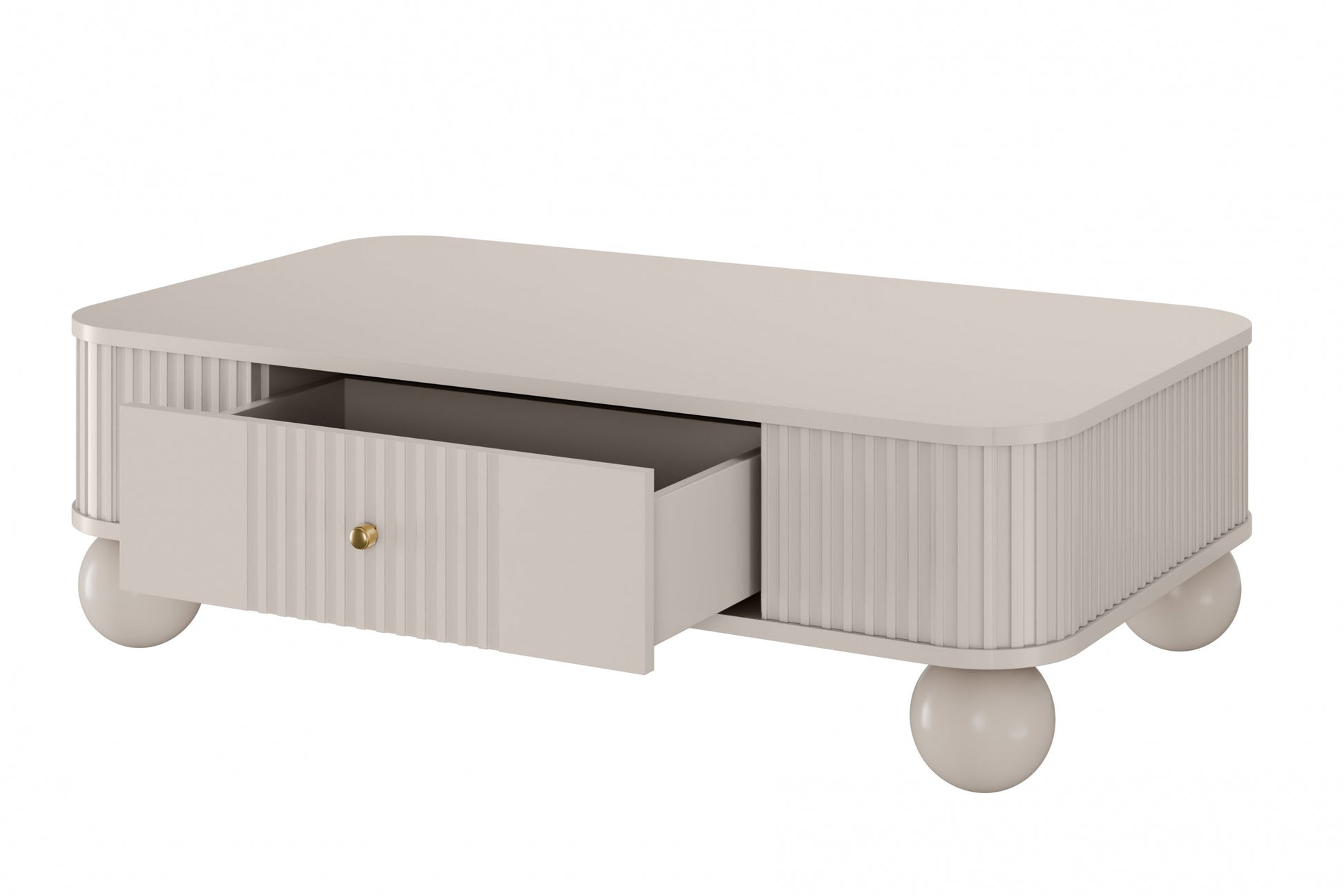 Ontdek de Vesper salontafel, een perfecte mix van elegantie en functionaliteit voor elke moderne woonkamer. De zachte, kasjmierkleurige afwerking gecombineerd met luxe gouden handgrepen en opvallende bolvormige massief houten poten maakt deze tafel tot een stijlvolle blikvanger. De afgeronde randen en fijn gegroefde voorkant geven het meubel een uniek, eigentijds karakter. Dankzij de praktische lade, die soepel en geruisloos sluit, berg je gemakkelijk kleine spulletjes op zodat jouw woonkamer altijd netjes oogt.