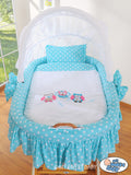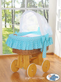 Spjälsängskorg - rottingspjälsäng med huva - största liggytan, naturlig rotting, turkosa ugglor