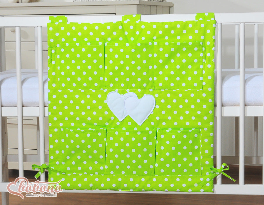 Praktisk spjälsängsförvaring i fräscht vitt och grönt, med ett sött prickigt mönster och motiv från Hanging Hearts-kollektionen. Med sex praktiska fack är den perfekt för att prydligt förvara leksaker, blöjor, våtservetter, nappar och andra babysaker.