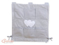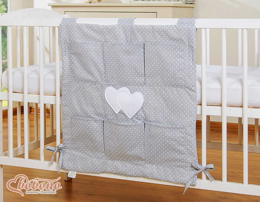 Praktisk och snygg spjälsängsförvaring med vita prickar mot grå bakgrund från Hanging Hearts-kollektionen. Den har sex rymliga fack för förvaring av leksaker, blöjor, våtservetter, nappar och andra viktiga babyartiklar.